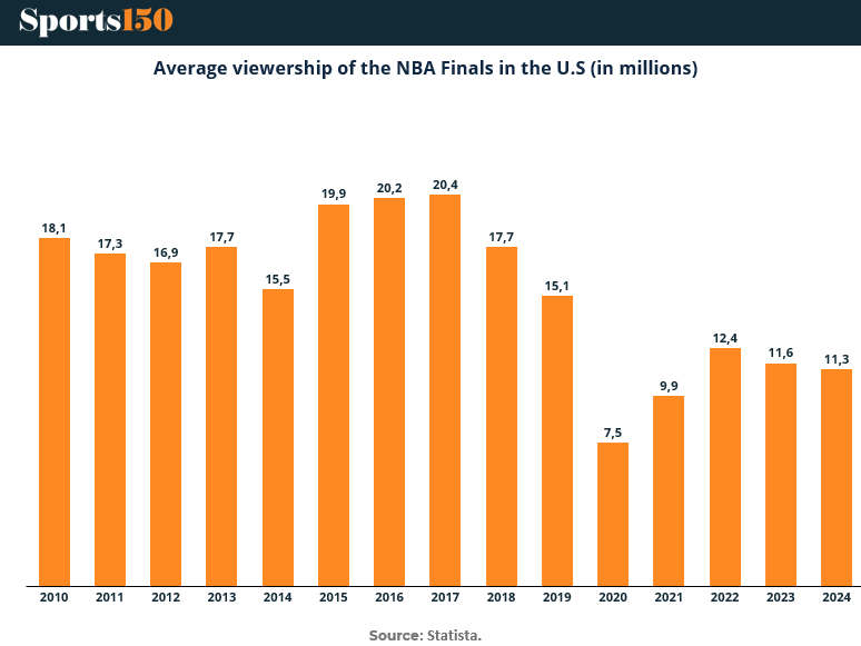 The NBA’s biggest stage isn’t drawing like it used to. Average U.S. viewership for the NBA Finals has dropped 44% since 2017, from 20.4M to just 11.3M in 2024, per Statista. Even with recent recovery from the pandemic-era low of 7.5M in 2020, the Finals haven’t cracked 13M since.