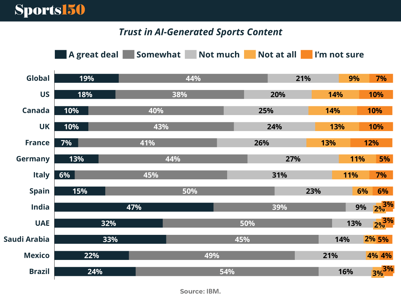 The geographic split matters. Asia and Latin America lead on trust, with markets like India, Brazil, Mexico, Saudi Arabia, and the UAE showing strong comfort with AI-led content. India stands out, where nearly half of fans report high trust, while Latin America skews toward “somewhat”—a sweet spot for rapid adoption.