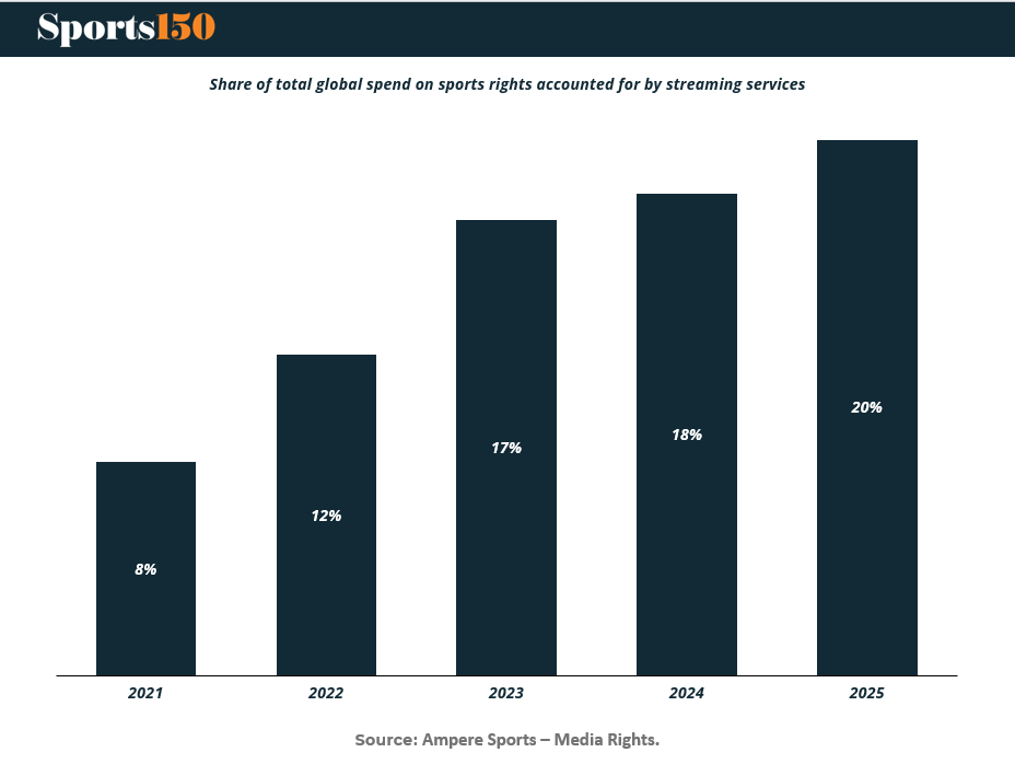 Streaming will account for 20% of global sports rights spend in 2025, hitting $12.5B, per Ampere. DAZN leads the pack, owning a third of that total, buoyed by a $1B FIFA Club World Cup deal and expansion in Germany, Italy, Spain, France, and soon Australia (via Foxtel).