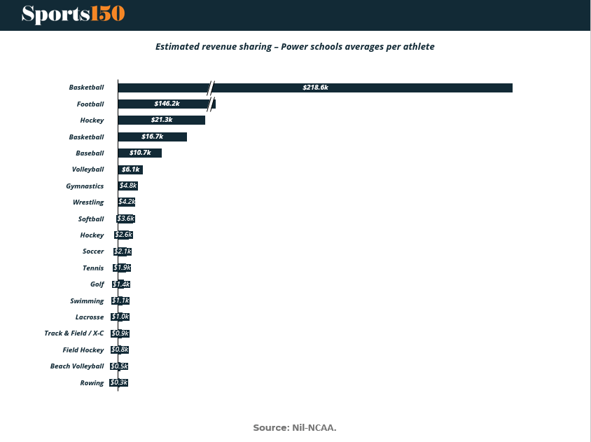 The chart tells the tale: Basketball players could pull in $278.6K, and football players $146.2K. By comparison, volleyball earns $6.1K, and rowing is under $1K.