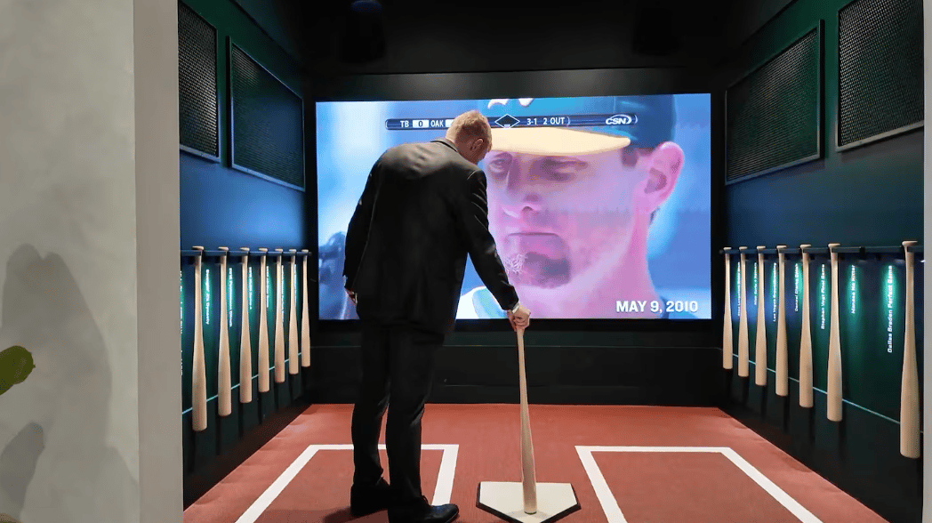 Beyond the Cube, the Center includes a bar, an event space, and a mini-theater wrapped around a digital “bat wall.” Pick up a bat labeled with an A’s legend—Dallas Braden, Rickey Henderson—and tap it against home plate to summon archival footage. It’s part museum, part sales tool, and fully engineered to convert interest into transactions.