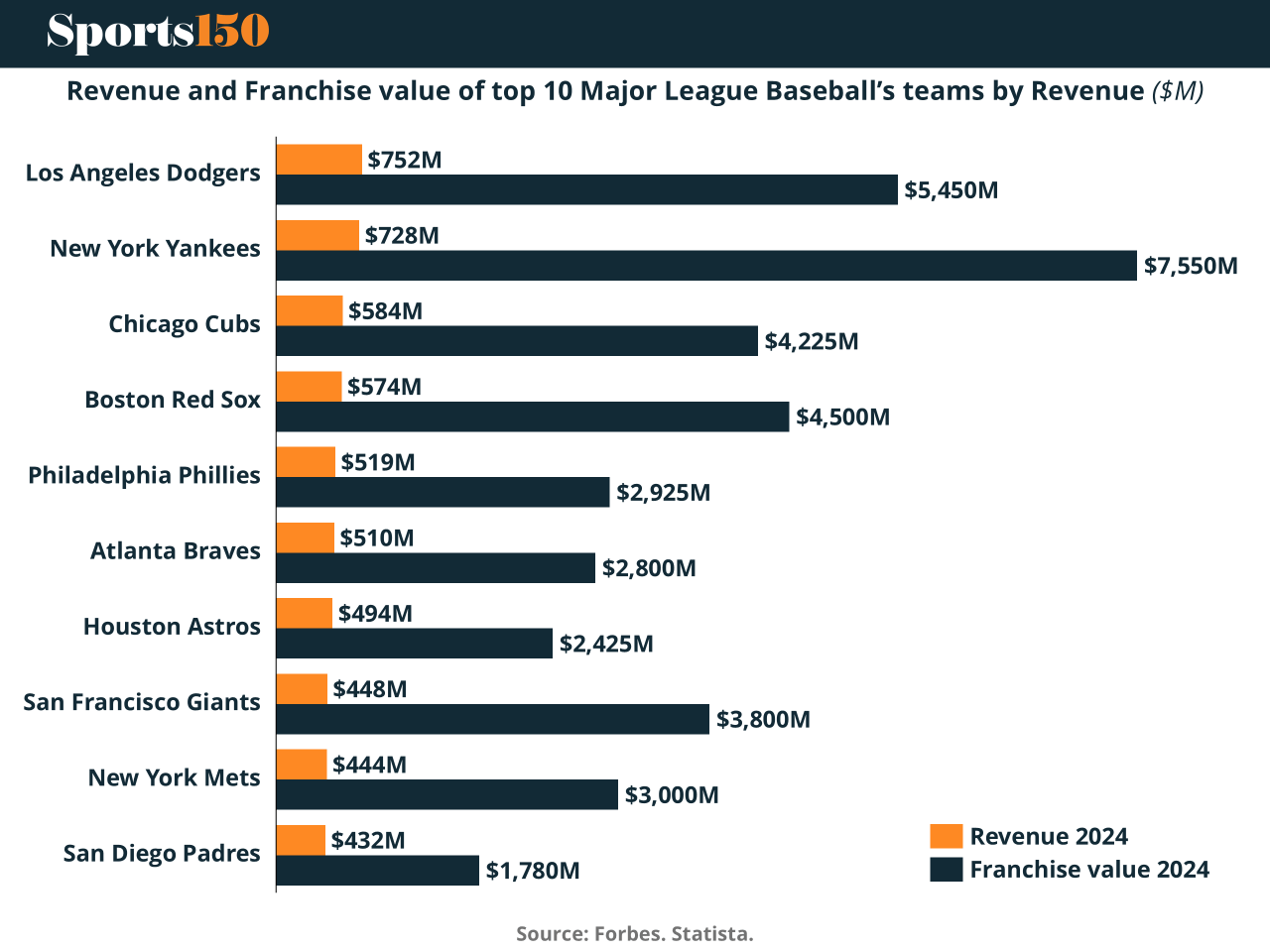 The economic foundations of Major League Baseball are largely rooted in two areas: team-level revenues and long-term franchise valuations. In 2024, the New York Yankees top the league with a franchise valuation of $7.55 billion and annual revenue of $728 million, a close second in income only to the Los Angeles Dodgers, who lead with $752 million in revenue but rank second in valuation at $5.45 billion. Other major market teams like the Chicago Cubs ($4.23 billion), Boston Red Sox ($4.5 billion), and San Francisco Giants ($3.8 billion) remain valuable, high-revenue entities.