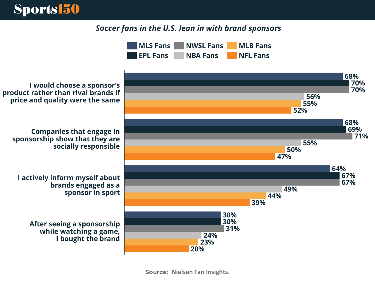 Nearly 70% of MLS, EPL, and NWSL fans say they’d pick a sponsor’s product over a rival brand—far outpacing the 50% loyalty rate among NBA, NFL, and MLB fans.